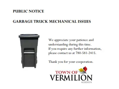 Please note that the garbage truck experienced mechanical issues on Friday. Therefore Friday, January 12 and Monday, January 15 commercial garbage pickups were missed.