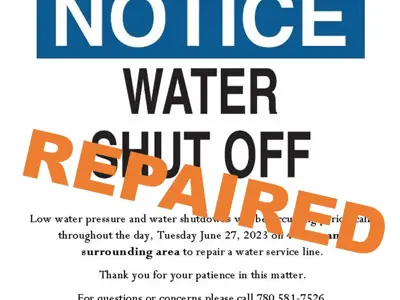 Notice of Water Restrictions effective June 8, 2023. The Alberta Central East Water Corporation will be shutting down the regional water transmission main from June 8, 2023 until further notice.