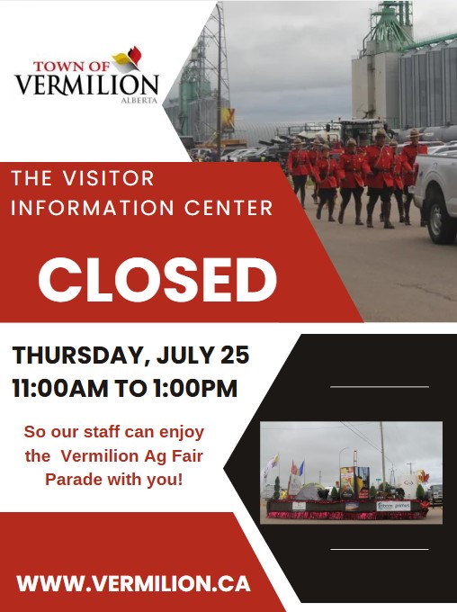 The administration office will be closed to allow all staff to attend the Vermilion Fair Parade from approximately 11am to 1pm on Thursday July 24, 2025.