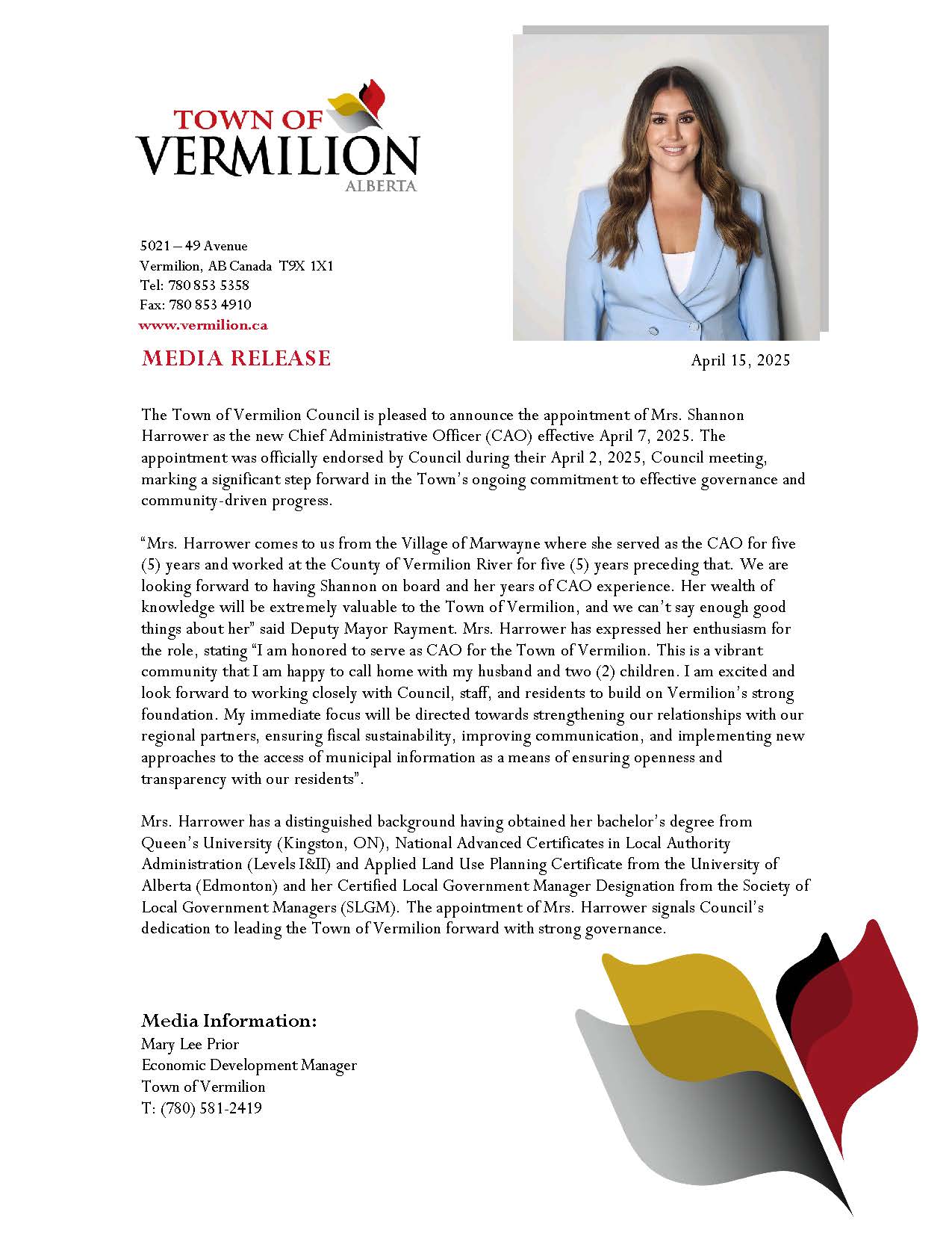 Council appoints new Interim CAO. Town of Vermilion, May 8, 2024 - At their May 7, 2024, regular Council Meeting, Council for the Town of Vermilion appointed Michael van der Torre as interim CAO - MOTION #24/05/68.